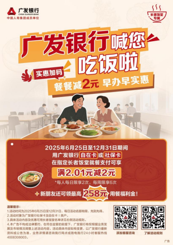 廣發(fā)銀行惠州分行積極響應(yīng)號(hào)召,以“長(zhǎng)者飯?zhí)脙?yōu)惠活動(dòng)”為切入點(diǎn),將金融服務(wù)深度融入社區(qū)養(yǎng)老場(chǎng)景,讓長(zhǎng)者在家門口就能享受便捷、實(shí)惠的助餐服務(wù)。目前惠州市就餐優(yōu)惠活動(dòng)覆蓋的單位有金沙俊園長(zhǎng)者飯?zhí)、城惠美食堂(德信居店)?家食堂,在2025年6月25日至12月31日期間,持有廣發(fā)銀行養(yǎng)老專屬“自在卡”或社?ǖ目蛻粼谝陨蠁挝痪筒,每人每天享有2次、每周享有6次滿2.01元立減2元的優(yōu)惠。未來(lái),該行將持續(xù)擴(kuò)大覆蓋范圍,讓普惠金融惠及更多長(zhǎng)者。