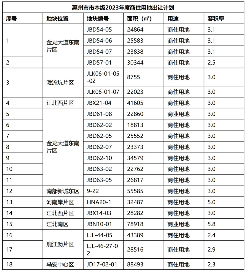 惠州日?qǐng)?bào)訊 (記者邱若蓉 通訊員陳佛良)當(dāng)前,隨著房地產(chǎn)相關(guān)利好政策不斷出臺(tái),惠州樓市正穩(wěn)步復(fù)蘇,拿地、拿好地成為各家房地產(chǎn)公司發(fā)力重點(diǎn)。4月10日,惠州市自然資源局發(fā)布《惠州市市本級(jí)2023年度商住用地出讓計(jì)劃》,惠州市本級(jí)今年計(jì)劃推出21宗商住用地,面積規(guī)模共計(jì)約70.74萬(wàn)平方米。