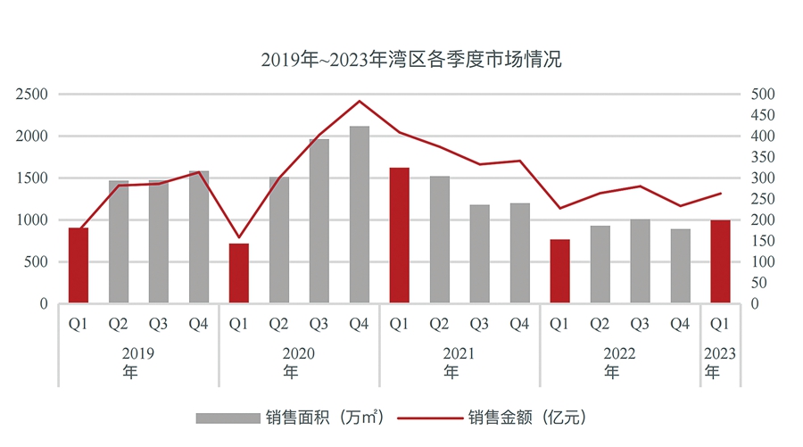 日前,世聯(lián)行發(fā)布的《2023年一季度大灣區(qū)樓市解讀及預(yù)判》報(bào)告顯示,今年一季度大灣區(qū)七城新房住宅成交面積同比上升30.09%,銷售金額同比上升15.42%。疫情影響消退、政策利好疊加刺激市場(chǎng)信心修復(fù),一季度大灣區(qū)房地產(chǎn)市場(chǎng)整體止跌回升,房企銷售面積、金額同比齊增。