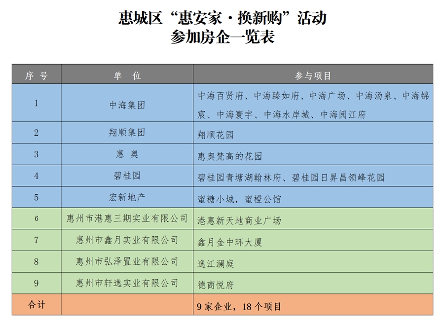目前“換新購(gòu)”已開(kāi)通購(gòu)房報(bào)名方式,詳情可關(guān)注惠州市房地產(chǎn)業(yè)協(xié)會(huì)、惠州市房地產(chǎn)中介行業(yè)協(xié)會(huì)的相關(guān)網(wǎng)站、微信公眾號(hào)。
