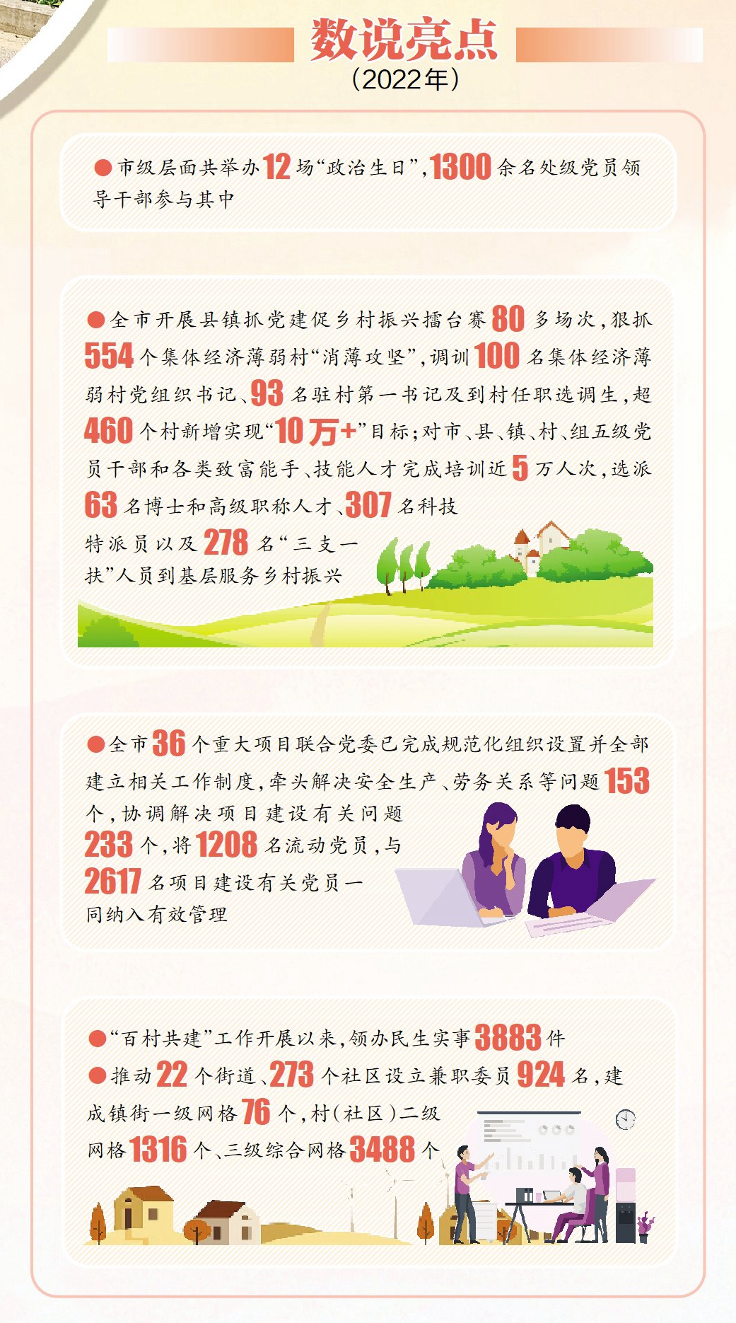 黨的建設(shè)是抓好各項(xiàng)工作的根本。生動(dòng)活潑、亮點(diǎn)紛呈的黨建工作,能夠有效提升基層黨組織的組織力和黨員隊(duì)伍的戰(zhàn)斗力,對(duì)經(jīng)濟(jì)社會(huì)發(fā)展起到強(qiáng)有力的推動(dòng)作用。2022年,惠州堅(jiān)持以習(xí)近平新時(shí)代中國(guó)特色社會(huì)主義思想為指導(dǎo),深入貫徹落實(shí)新時(shí)代黨的建設(shè)總要求和新時(shí)代黨的組織路線,真抓實(shí)干、開拓創(chuàng)新,切實(shí)把黨的政治優(yōu)勢(shì)、組織優(yōu)勢(shì)轉(zhuǎn)化為推動(dòng)各項(xiàng)工作開展的優(yōu)勢(shì),為惠州高質(zhì)量發(fā)展提供了堅(jiān)強(qiáng)組織保證。