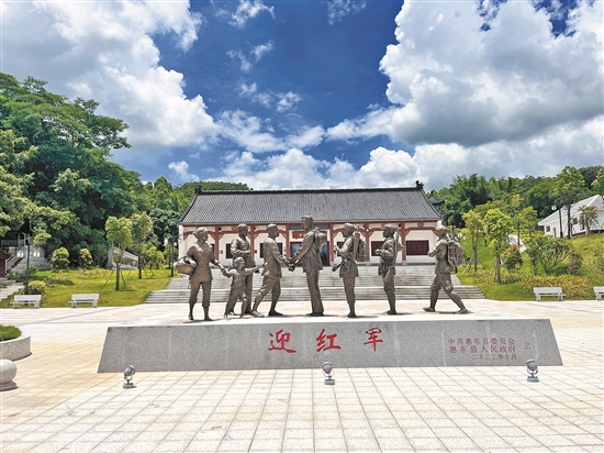 栩栩如生的雕塑描繪著雁湖村村民攜妻帶兒迎紅軍的場景