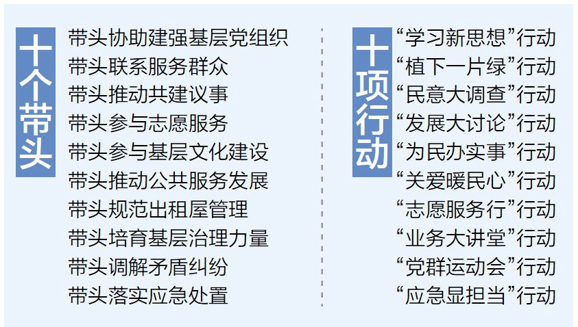 “十個帶頭”,即帶頭協(xié)助建強基層黨組織、帶頭聯(lián)系服務(wù)群眾、帶頭推動共建議事、帶頭參與志愿服務(wù)、帶頭參與基層文化建設(shè)、帶頭推動公共服務(wù)發(fā)展、帶頭規(guī)范出租屋管理、帶頭培育基層治理力量、帶頭調(diào)解矛盾糾紛、帶頭落實應(yīng)急處置。
