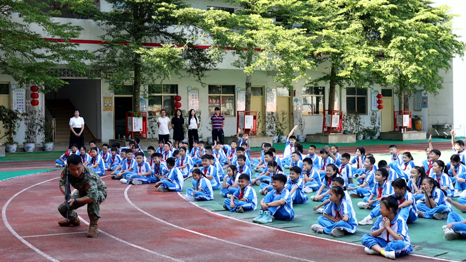 開學當天,惠東縣港口紅軍小學300余名師生齊聚操場,上了一堂別開生面的“開學第一課”。中國好人、港口英雄民兵連連長李偉美以《港口英雄民兵連鑄就新的南海長城》為題作宣講,“呯、呯、呯……突然,半山腰響起了槍聲……”主講人李偉美生動再現(xiàn)了當年先烈在小星山戰(zhàn)斗的場景,現(xiàn)場還帶來了舊槍支展示給同學們看,全校師生還一起學唱英雄民兵連連歌。宣講結(jié)束后,同學們對這次宣講送上了熱烈的掌聲。