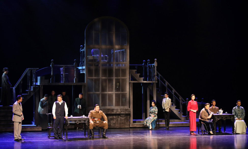 隨著照明燈漸漸熄滅,序幕緩緩拉開(kāi)。上世紀(jì)40年代中西結(jié)合的廣府室內(nèi)陳設(shè)躍然臺(tái)上,中式藤編桌椅、西式沙發(fā)座鐘、首飾盒、高腳杯、茶壺……處處都透露著講究,把觀眾帶回那個(gè)硝煙四起的年代。