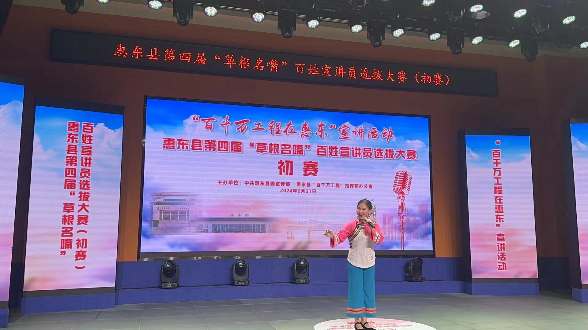 近日,惠東縣第四屆“草根名嘴”百姓宣講員選拔暨“百千萬(wàn)工程在惠東”宣講活動(dòng)火熱進(jìn)行;顒(dòng)現(xiàn)場(chǎng),來(lái)自各鎮(zhèn)(街、度假區(qū)、旅游區(qū))黨(工)委和縣直、駐惠東有關(guān)單位的26名選手,通過(guò)生動(dòng)的語(yǔ)言和感人的故事,展示自己對(duì)于“百千萬(wàn)工程在惠東”的理解和感悟,傳遞社會(huì)正能量。經(jīng)過(guò)激烈角逐,16名選手晉級(jí),決賽將于7月12日進(jìn)行。