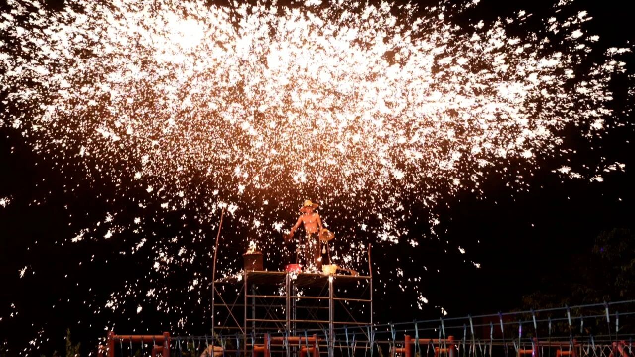梁化鎮(zhèn)小禾洞見生態(tài)園非遺打鐵花表演。 通訊員戴相國 攝