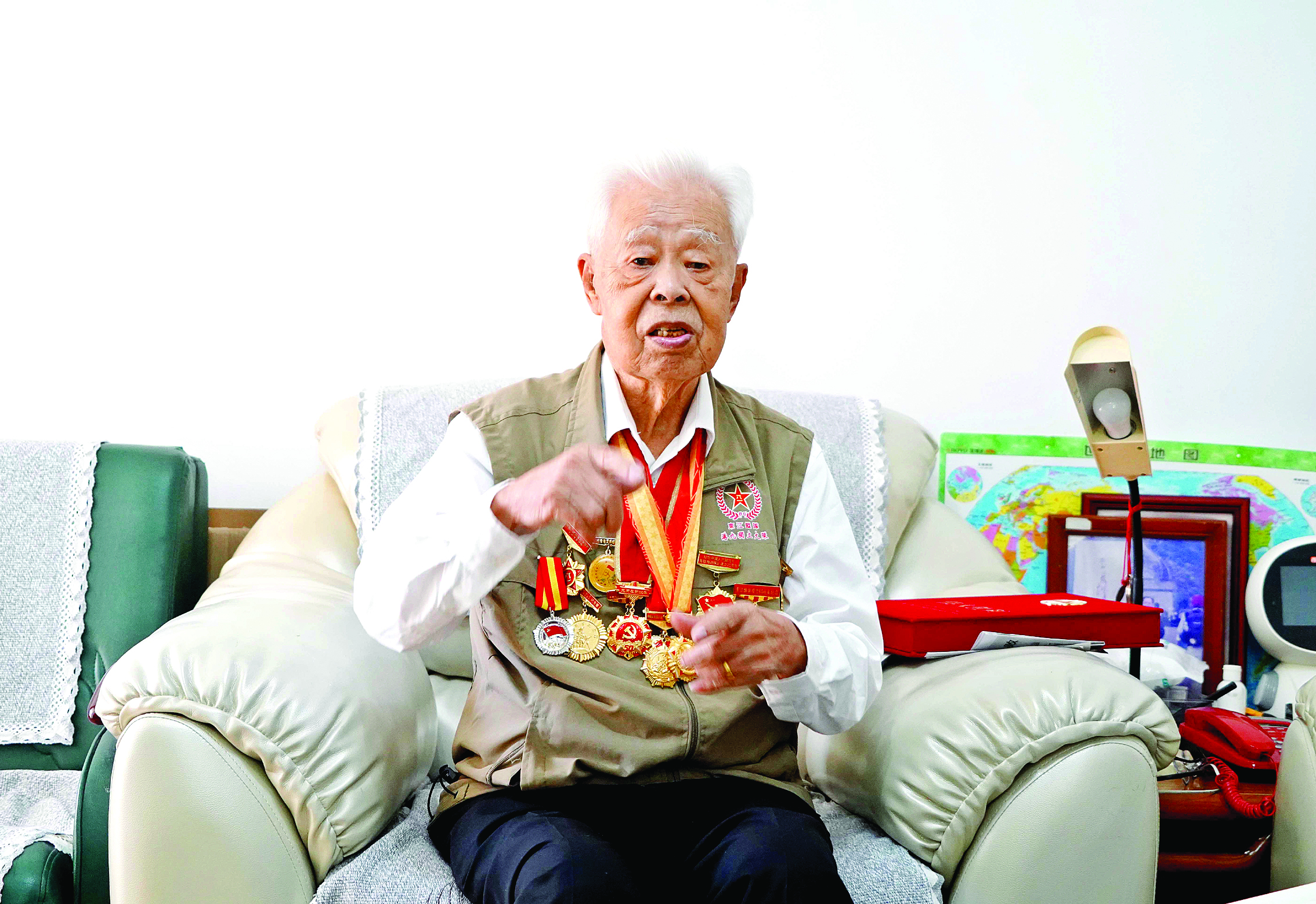 腰板挺直、精神矍鑠,初見羅競(jìng)輝,94歲的他面帶微笑,精氣神很足。他站立在家門口,與到訪者一一握手、問好,胸前一枚枚勛章熠熠生輝,讓人仿佛看到當(dāng)年那個(gè)在驚濤駭浪中,與日寇反復(fù)周旋的英勇少年。