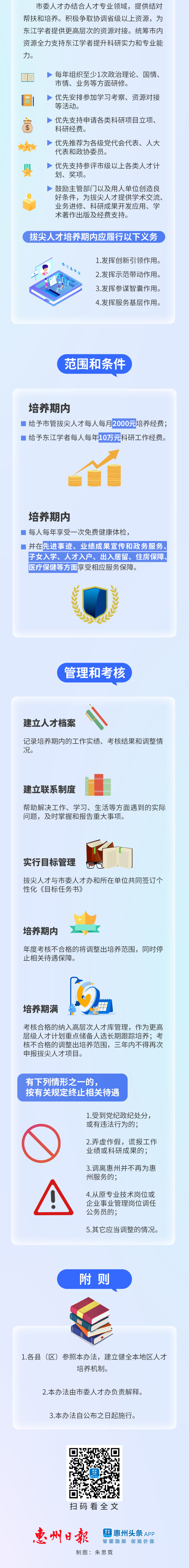 同時,《辦法》規(guī)定,申報對象一般應在惠州工作至少滿一年,入選后能繼續(xù)在惠州工作至少滿三年。