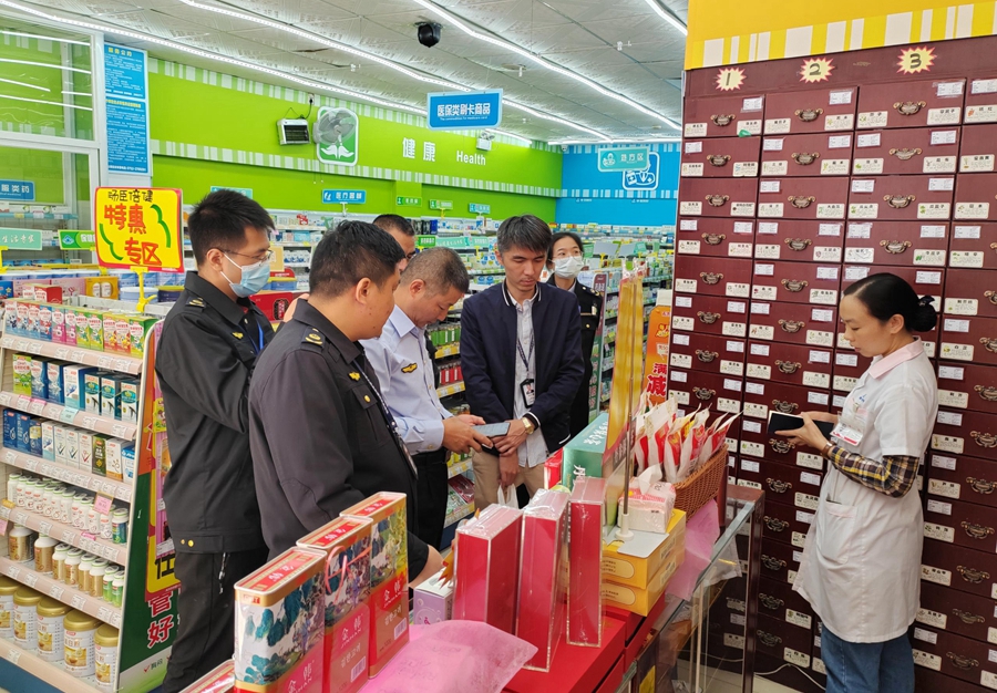 惠州市市場監(jiān)督管理局與惠城區(qū)市場監(jiān)督管理局執(zhí)法人員對藥店開展專項檢查。東江圖片社供圖