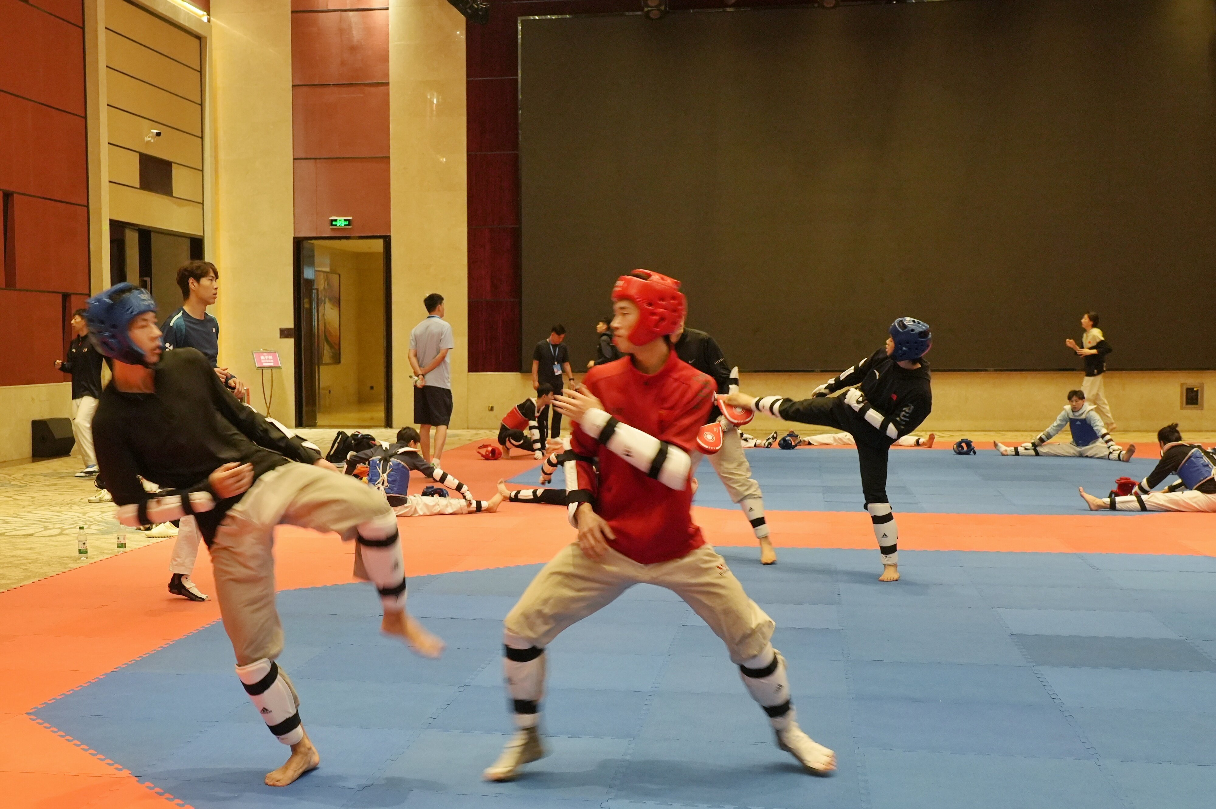 6月16日10時,記者探訪運動員下榻的酒店。為提供更便利的訓練條件,酒店將宴會廳臨時改造為訓練室,鋪上厚厚的地毯。下劈、橫踢、旋風踢……運動員們正緊張有序地進行熱身訓練,盡顯專業(yè)水準。