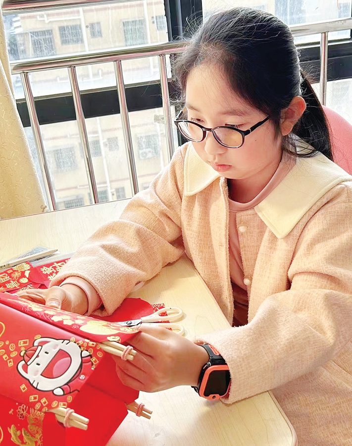 不少學(xué)校的寒假德育實(shí)踐作業(yè)設(shè)計了春節(jié)主題;葜菔谢莩菂^(qū)德威江譽(yù)誠小學(xué)讓孩子們動手寫春聯(lián),幫助父母貼春聯(lián);或做新年賀卡,寫上對親人美好的祝福語……該校五(1)班的陳毓瀅就用“利是包”做了個紅燈籠。