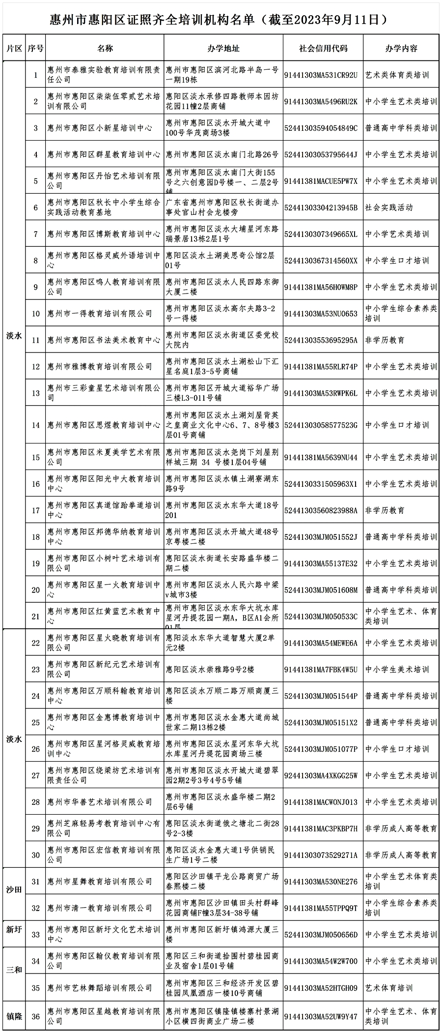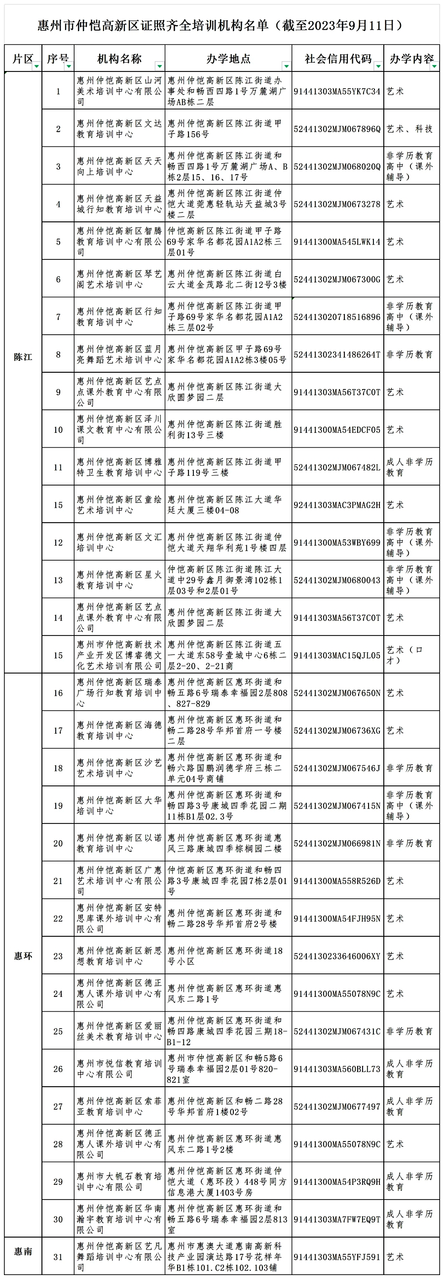 為進(jìn)一步鞏固我市“雙減”工作成果,方便廣大學(xué)生及家長(zhǎng)查詢(xún)和選擇合法合規(guī)教育培訓(xùn)機(jī)構(gòu),9月18日,惠州市教育局發(fā)布《關(guān)于公布惠州市證照齊全培訓(xùn)機(jī)構(gòu)名單的公告》,公布我市由教育行政部門(mén)審批監(jiān)管的證照齊全培訓(xùn)機(jī)構(gòu)名單(截至2023年9月11日)。