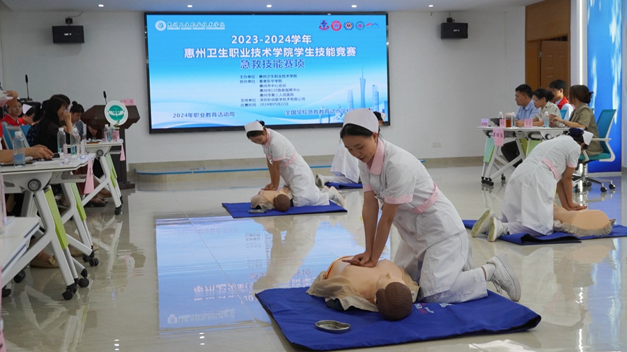 本次活動(dòng)作為惠州衛(wèi)生職業(yè)技術(shù)學(xué)院2024年職業(yè)教育活動(dòng)周的項(xiàng)目之一,除了急救培訓(xùn)外,還包括學(xué)生心肺復(fù)蘇競(jìng)賽。競(jìng)賽選手均為該校護(hù)理學(xué)院2023級(jí)3+2、3+證書以及2022級(jí)護(hù)理、助產(chǎn)專業(yè)的學(xué)生。他們是在完成相關(guān)實(shí)訓(xùn)操作課程后,經(jīng)過多輪篩選脫穎而出的優(yōu)秀選手。在職業(yè)教育活動(dòng)周期間,惠州衛(wèi)生職業(yè)技術(shù)學(xué)院還組織了師生無償獻(xiàn)血和科普義診活動(dòng)。