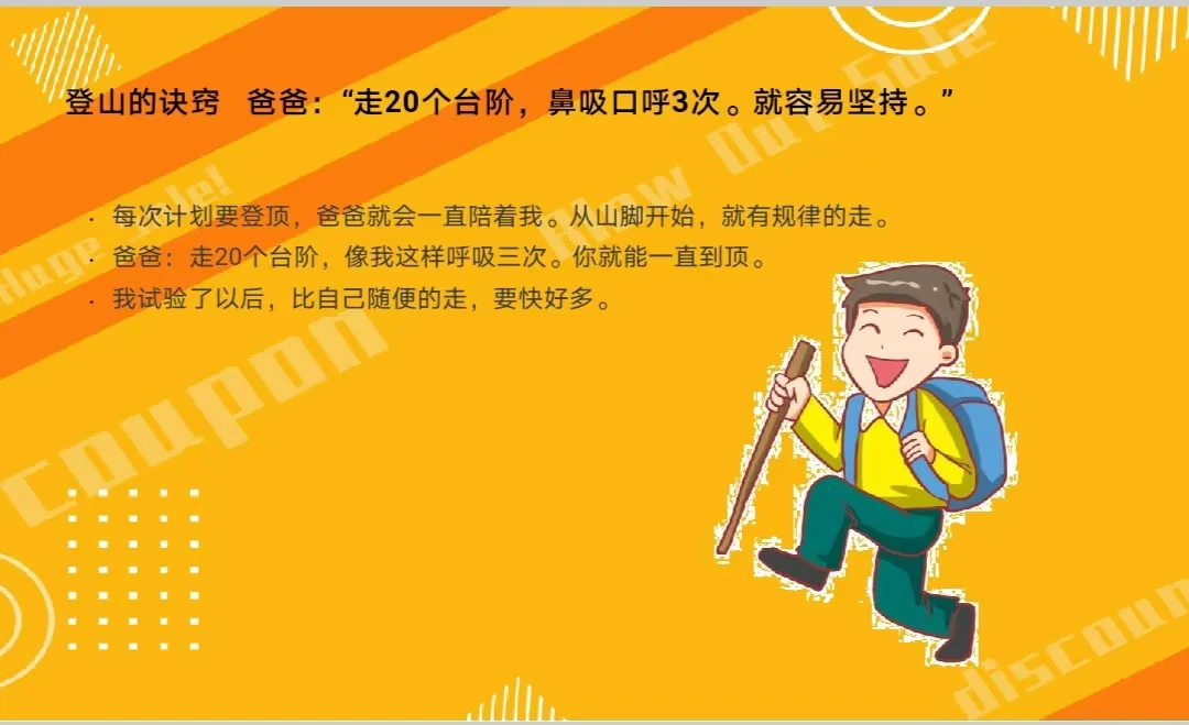 兒子的觀察力也好。十多次之后,他說:“爸爸,很少看到有爸爸帶兒子登山的,一般都是媽媽帶!