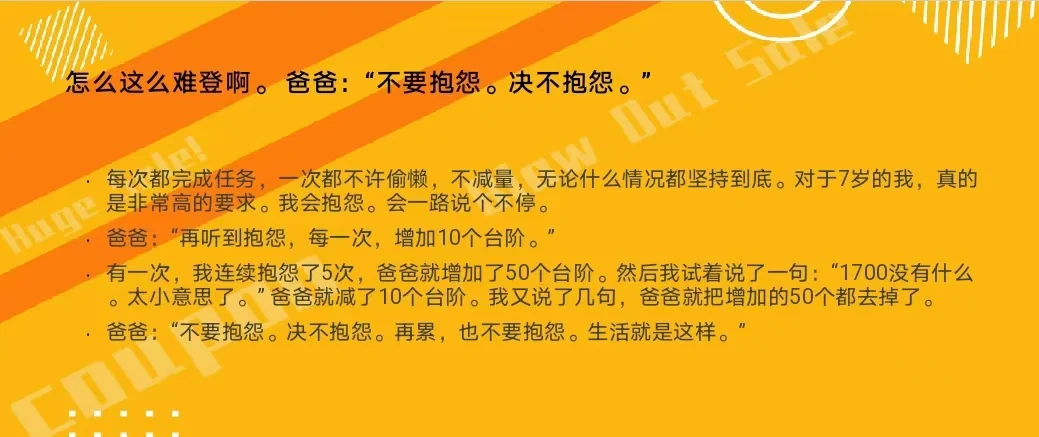 2 .每次堅持都有一定的難度。從最開始的1300米,到后來基本穩(wěn)定在1700米。有四次,到頂。特別是開始的幾次,兒子一起步就說累,不想走,雙手拖著我的一只手,說不想登了。到了600米了,又開始討價還價,說,今天到1000米,就可以了。到了1300米之后,又說,到這里就可以了。到了1500米,又說,為什么以前到這里就可以了?