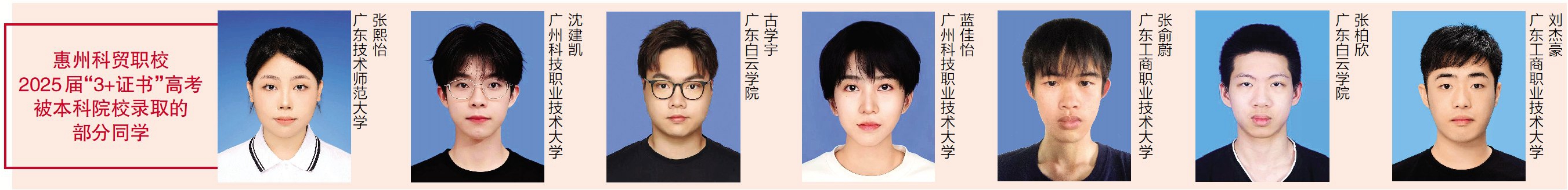 四月的惠州,處處涌動(dòng)著春夏之交的蓬勃?dú)庀ⅰT诨葜菔锌瀑Q(mào)職業(yè)技術(shù)學(xué)校(以下簡(jiǎn)稱科貿(mào)職校)的光榮榜上,2025屆“3+證書”高考成績(jī)格外亮眼:本科上線人數(shù)達(dá)203人,較去年增加91人。眾多學(xué)子考入心儀的全日制本科院校、省“雙高計(jì)劃”一流高職院校,其中不乏從“及格線邊緣”逆襲到“超本科線90分”的勵(lì)志故事。這所中職學(xué)校如何讓基礎(chǔ)薄弱的學(xué)子叩開高等教育的大門?日前,惠州日?qǐng)?bào)記者走進(jìn)科貿(mào)職校校園,探尋其育人密碼。