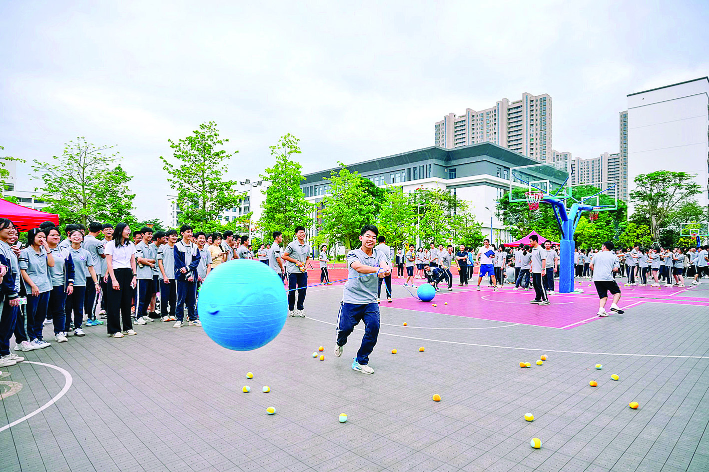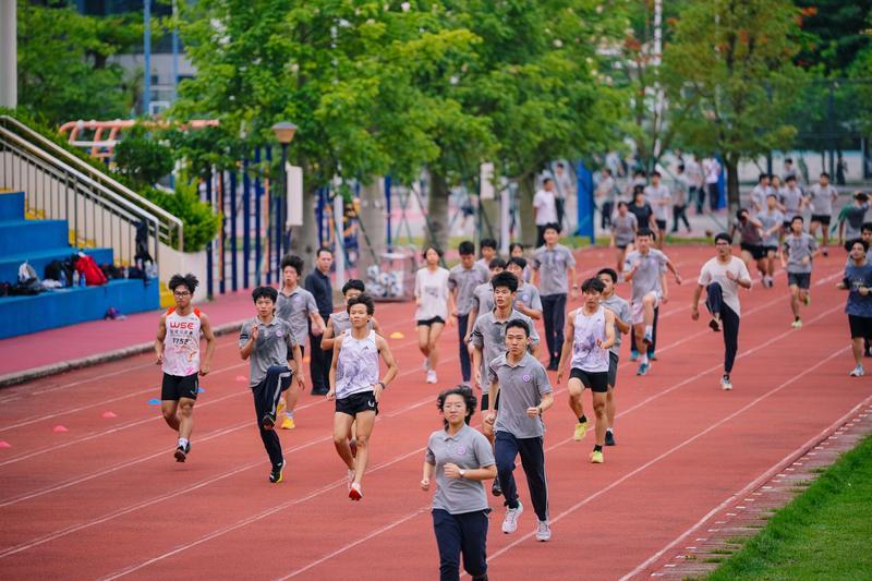 在惠州中學(xué)的操場(chǎng)上,每天下午五點(diǎn)總會(huì)響起此起彼伏的加油聲。高一年級(jí)的“20人21足”比賽正如火如荼進(jìn)行著,綁著護(hù)腕的同學(xué)們喊著整齊的口號(hào)向前沖刺;隔壁場(chǎng)地,高二學(xué)生正進(jìn)行飛盤對(duì)抗賽,陽(yáng)光下旋轉(zhuǎn)的飛盤劃出一道道優(yōu)美弧線;教學(xué)樓里,幾個(gè)男生借著課間10分鐘比拼引體向上,汗水浸透的校服刻印著青春的勛章。