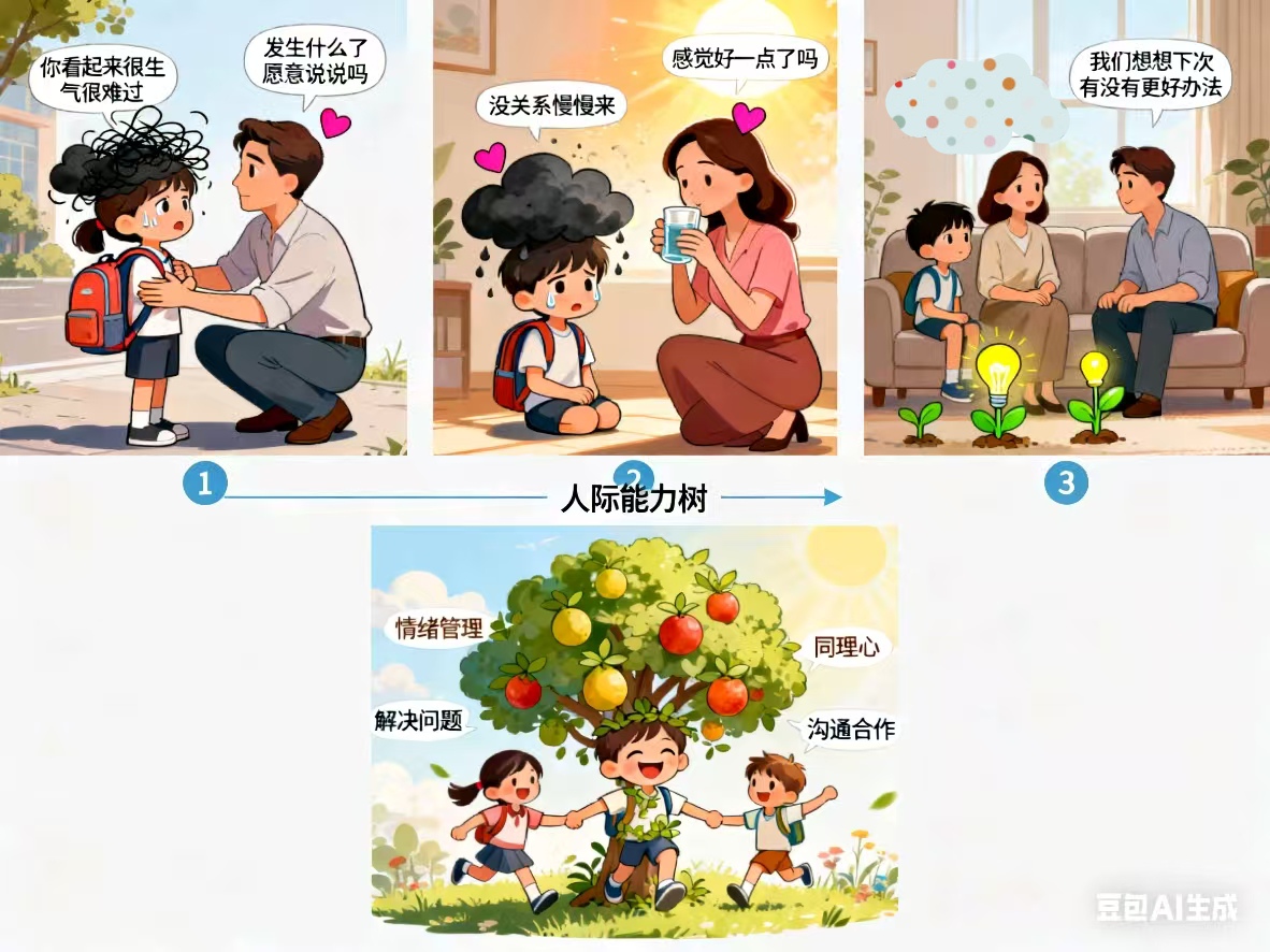 社交學(xué)習(xí),是每個孩子重要的成長課題之一。沖突,正是這條路上無法繞行的實踐課。父母的角色,不是清障者,而是教練員。當(dāng)沖突發(fā)生后,父母如果總是能先傾聽、接納孩子的情緒,待其平靜后再溫和地引導(dǎo),將會很好地幫助孩子發(fā)展出更成熟、更有效的人際交往能力。