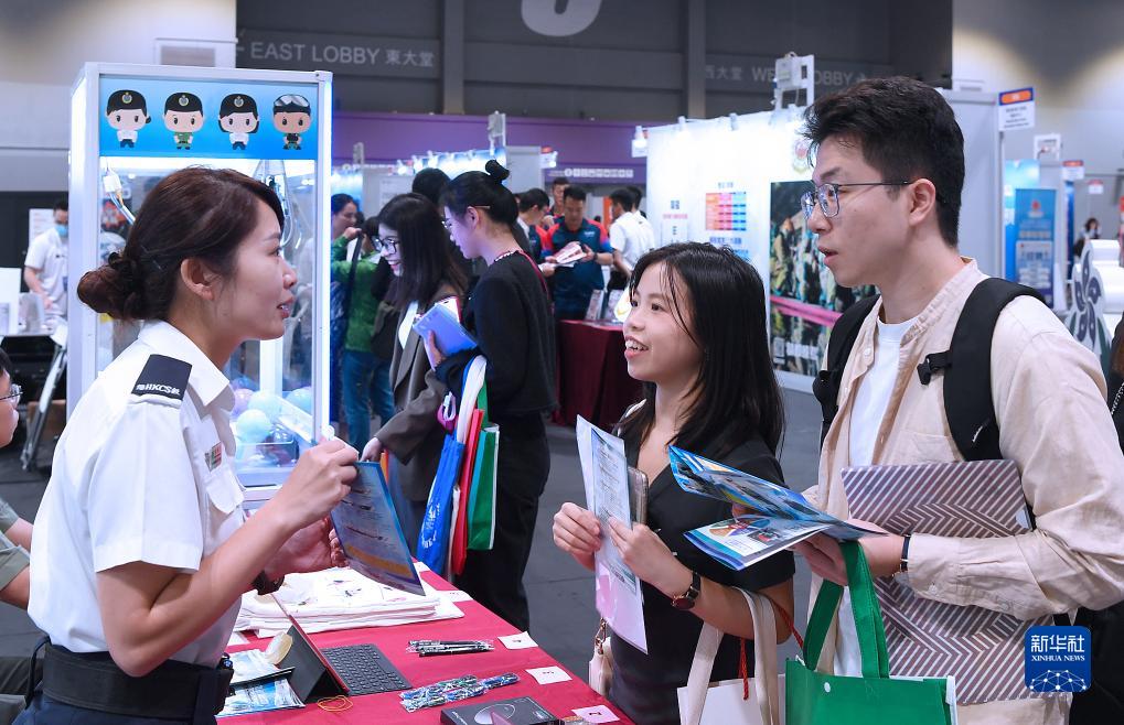 11月4日,香港懲教署招聘人員(左)向求職者介紹崗位信息。新華社記者 陳鐸 攝