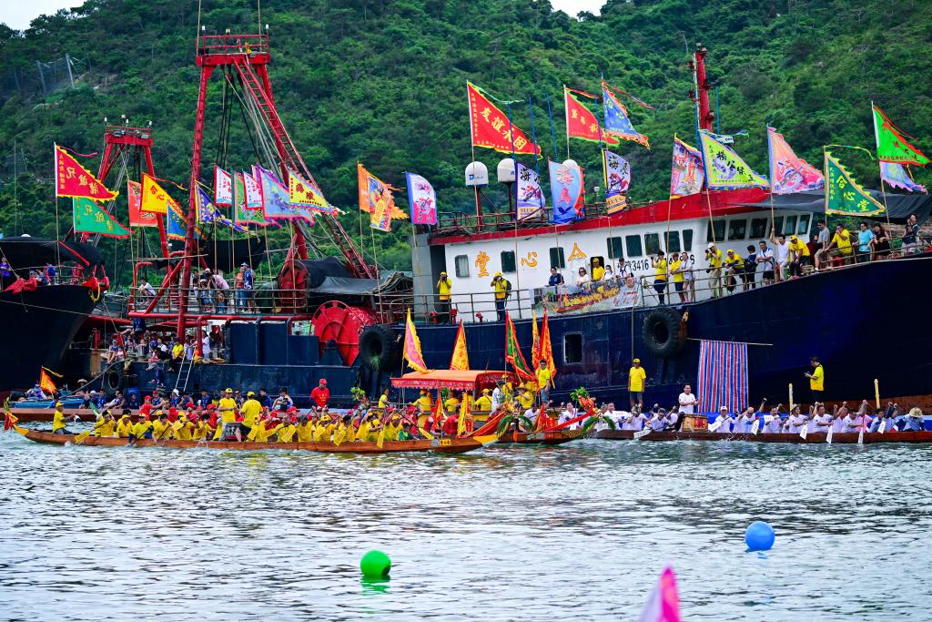 10日一大早,大澳人聲鼎沸、彩旗飄飄、鑼鼓震天。各行會(huì)成員劃著龍舟到山邊采集青草,然后將青草放進(jìn)龍口,稱為“采青”。11時(shí)許,三條龍舟拖著載有神像的小艇開始在大澳水道巡游,沿途的棚屋居民也同時(shí)朝著巡游的龍舟焚香祭拜。游涌完畢,三條龍舟開始比賽,將活動(dòng)推向高潮。