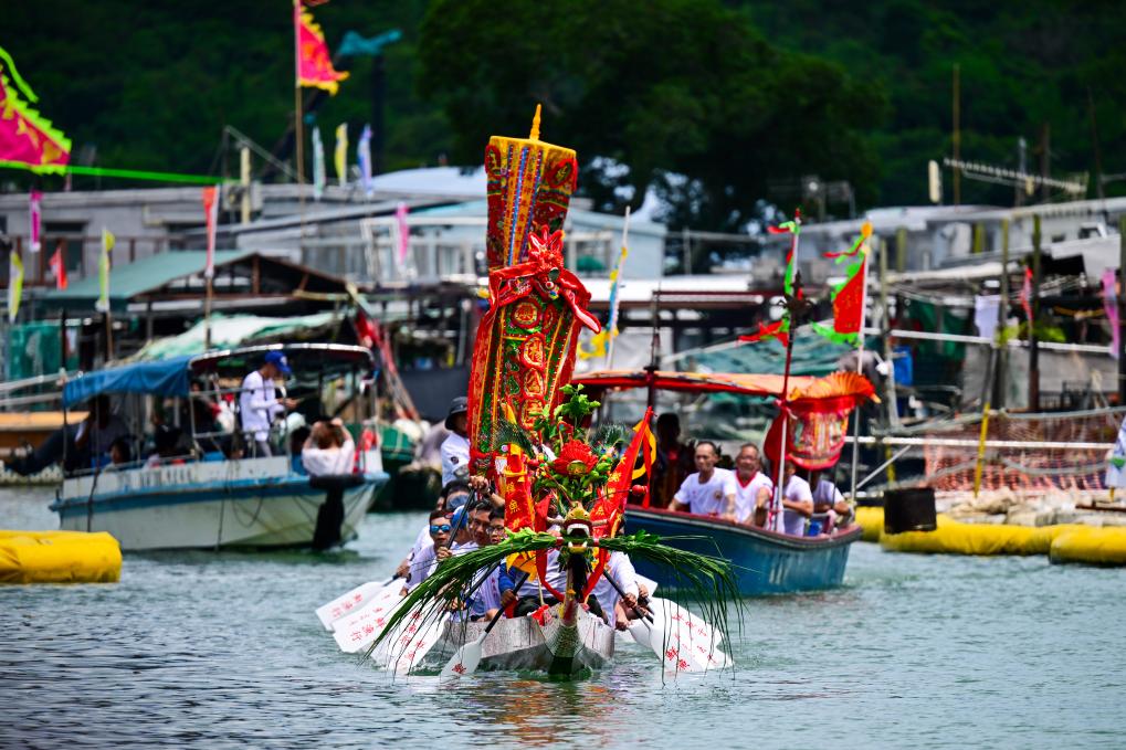 6月10日,參加大澳端午龍舟游涌活動(dòng)的鮮魚行龍舟,拖著載有神像的小艇在大澳水道巡游。新華社記者 朱煒 攝