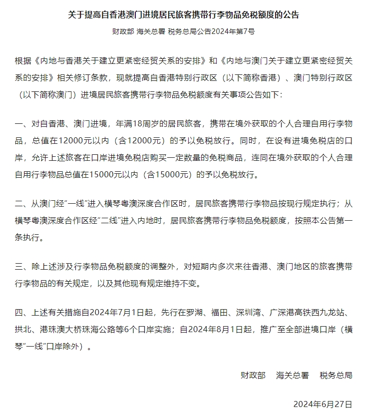 商務(wù)部28日對(duì)外公布,內(nèi)地與香港、內(nèi)地與澳門(mén)在《關(guān)于建立更緊密經(jīng)貿(mào)關(guān)系的安排》(CEPA)機(jī)制下經(jīng)過(guò)磋商,同意提高自香港、澳門(mén)進(jìn)境居民旅客攜帶行李物品免稅額度,相關(guān)內(nèi)容納入《CEPA貨物貿(mào)易協(xié)議》。具體措施由業(yè)務(wù)主管部門(mén)對(duì)外公布實(shí)施。