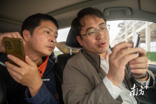 呂崇君在車上與項(xiàng)目方相關(guān)負(fù)責(zé)人協(xié)調(diào)解決施工過程中遇到的問題。南方日報記者 徐昊 攝