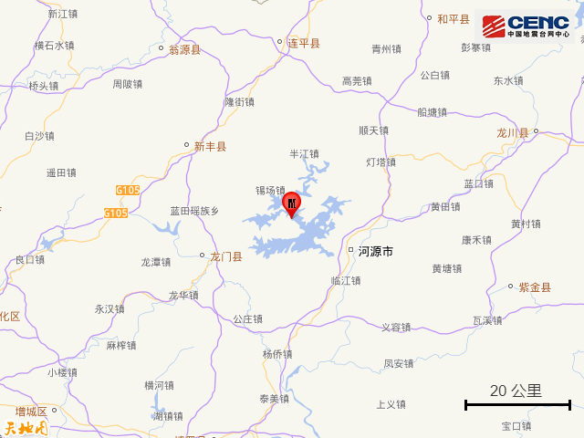 周邊縣城:震中距源城區(qū)22公里、距東源縣24公里、距龍門縣30公里、距新豐縣40公里、距連平縣59公里,距河源市21公里,距廣州市150公里!