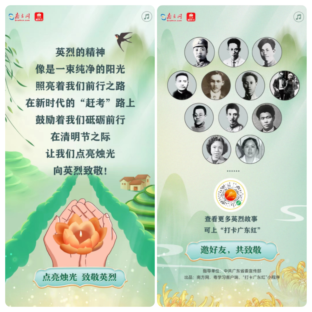 今天是清明節(jié),南方網(wǎng)、粵學(xué)習(xí)客戶端與“打卡廣東紅”小程序聯(lián)合推出《H5|祭英烈,勵(lì)前行——“英烈之光”照亮前行路》線上祭奠英烈活動(dòng)。
