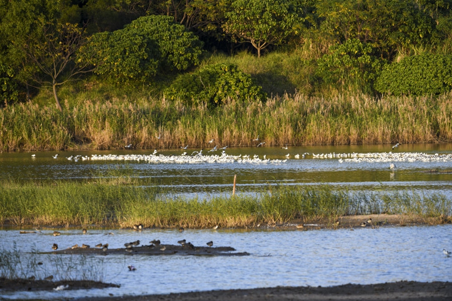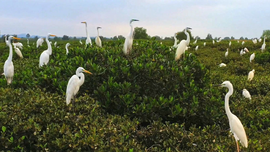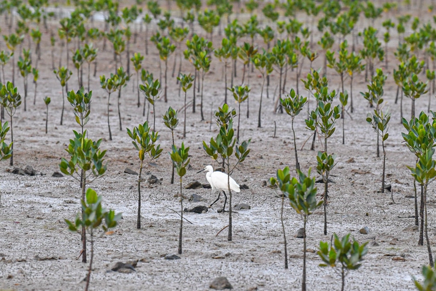 ↑鷺鳥在海南儋州市新英鹽場濕地人工栽種的紅樹林間覓食(2022年11月8日攝)。