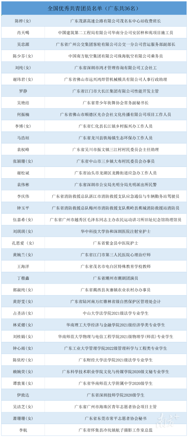 全國(guó)優(yōu)秀共青團(tuán)員名單(廣東共36名)