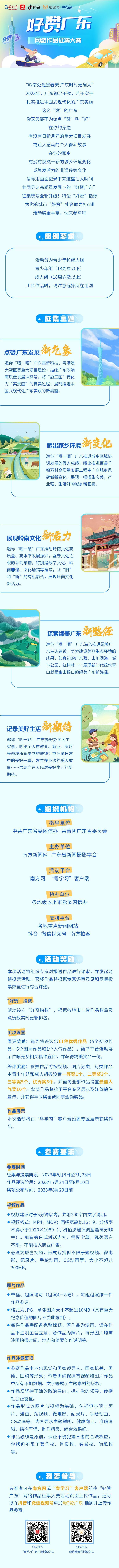 活動(dòng)面向全網(wǎng)征集原創(chuàng)作品,邀請(qǐng)廣大網(wǎng)民從各個(gè)角度“曬”出廣東新形象,為廣東點(diǎn)“贊”叫“好”。參賽作品需緊扣“好贊廣東”主題,從宏觀角度展示廣東重大項(xiàng)目、高新科技、大灣區(qū)建設(shè),或是曬出家鄉(xiāng)的嶄新變化、瑰麗多彩的嶺南風(fēng)情、美不勝收的綠水青山,講好廣東的新時(shí)代故事;從微觀角度記錄日常中的偶遇一景、美好一幕,或是自己或身邊人的奮斗經(jīng)歷,展現(xiàn)廣東帶給人們的暖意、愜意和詩(shī)意。