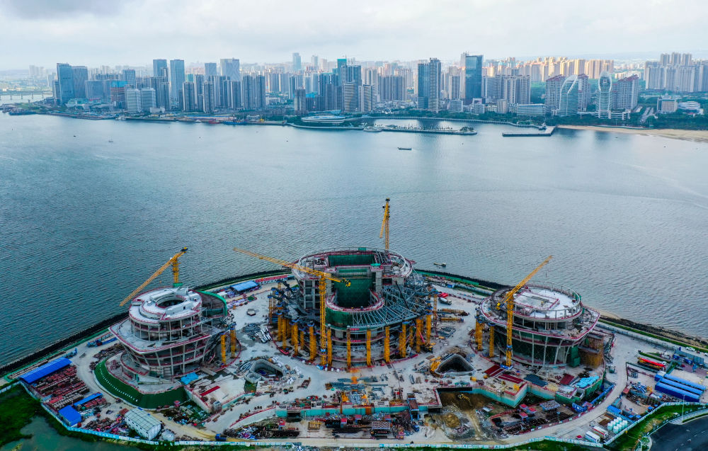 中建深裝承建的湛江市文化中心三館開始安裝幕墻,建成后這里將成為湛江文化新地標(biāo)(5月26日攝,無(wú)人機(jī)照片)。新華社記者 劉大偉 攝