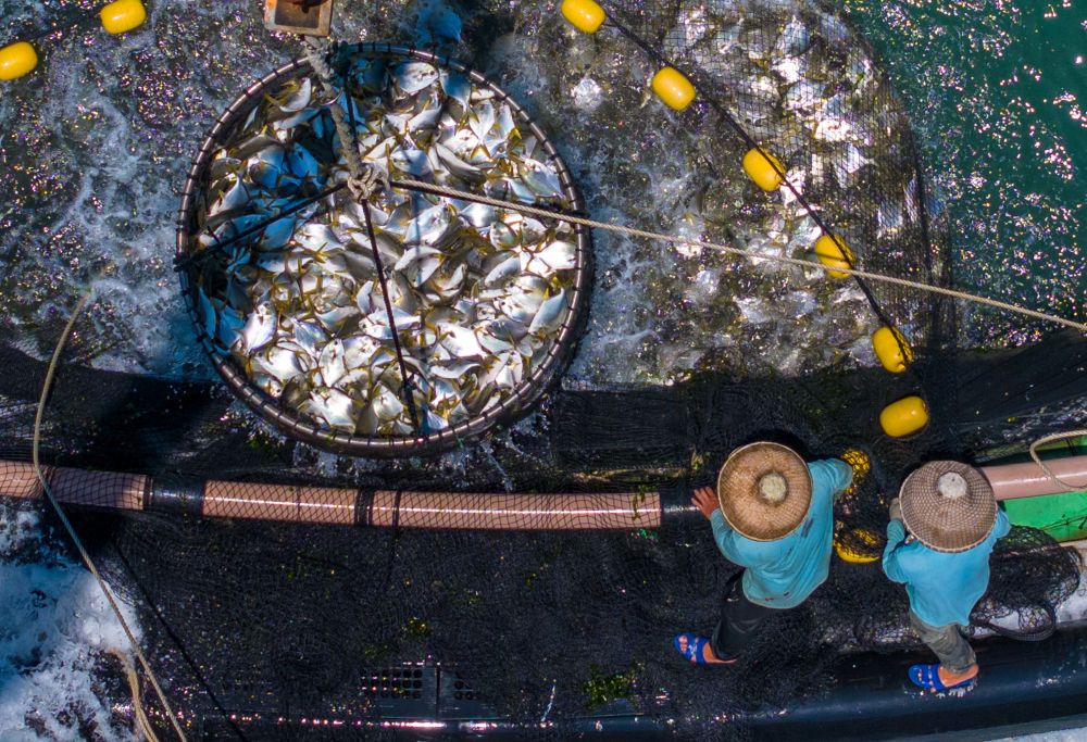 5月27日,在湛江徐聞西連鎮(zhèn),漁業(yè)工人從深海網(wǎng)箱中打撈金鯧魚(無(wú)人機(jī)照片)。新華社記者 毛思倩 攝