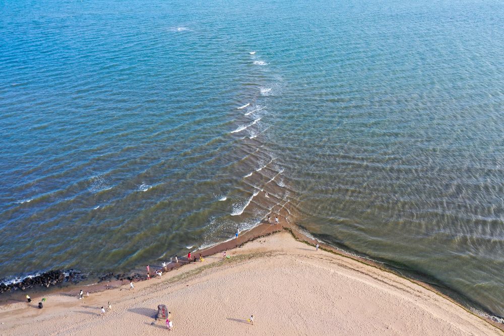 5月28日,游客在“南極村”趕海(無(wú)人機(jī)照片)。新華社記者 梁旭 攝