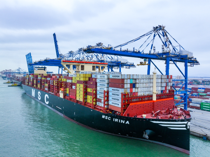 我國自主研制的全球最大集裝箱船“地中海伊琳娜”(MSC IRINA)號(最大裝箱量24346標(biāo)準(zhǔn)箱)靠泊在廣州港南沙二期集裝箱碼頭