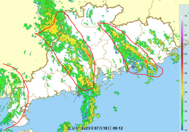 截至18日9時(shí)25分,從天氣雷達(dá)回波圖看,廣東雨帶呈條狀,與臺(tái)風(fēng)外圍環(huán)流相似。目前,全省降雨集中在湛江、江門、廣州、汕尾、河源等地。其中,廣州的越秀、天河、海珠、白云、番禺已發(fā)布暴雨橙色預(yù)警。