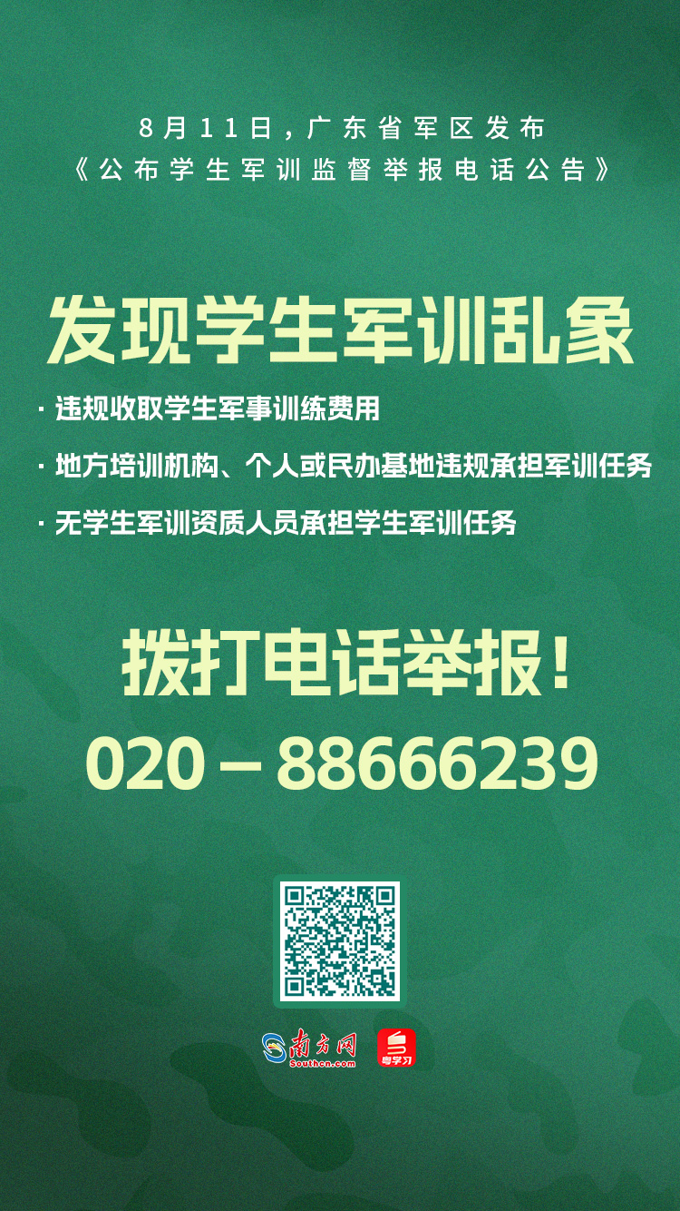 8月11日,廣東省軍區(qū)發(fā)布了《公布學(xué)生軍訓(xùn)監(jiān)督舉報(bào)電話(huà)公告》。據(jù)了解,為全面加強(qiáng)新時(shí)代學(xué)生軍訓(xùn)工作,貫徹落實(shí)立德樹(shù)人根本任務(wù)和強(qiáng)軍目標(biāo)根本要求,堅(jiān)決杜絕學(xué)生軍訓(xùn)商業(yè)化市場(chǎng)化問(wèn)題,廣東省軍區(qū)學(xué)生軍訓(xùn)工作辦公室公布學(xué)生軍訓(xùn)商業(yè)化市場(chǎng)化問(wèn)題監(jiān)督舉報(bào)電話(huà),請(qǐng)廣大群眾予以監(jiān)督。