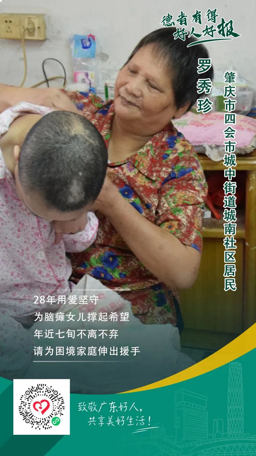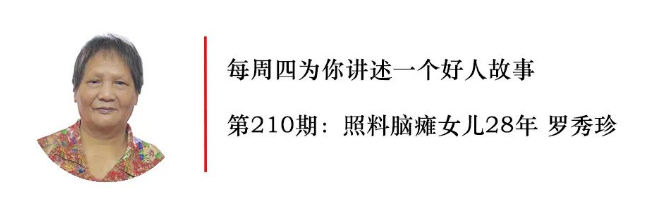 羅秀珍是肇慶市四會(huì)市城中街道城南社區(qū)居民,年過七旬的她28年來一直照顧癱瘓?jiān)诖驳呐畠海瑥臐M頭青絲到兩鬢斑白,她對(duì)女兒不離不棄,抒寫了一首偉大的母愛之歌。羅秀珍榮獲2018年第一季度“廣東好人”、2019年第二季度“中國好人”稱號(hào)。