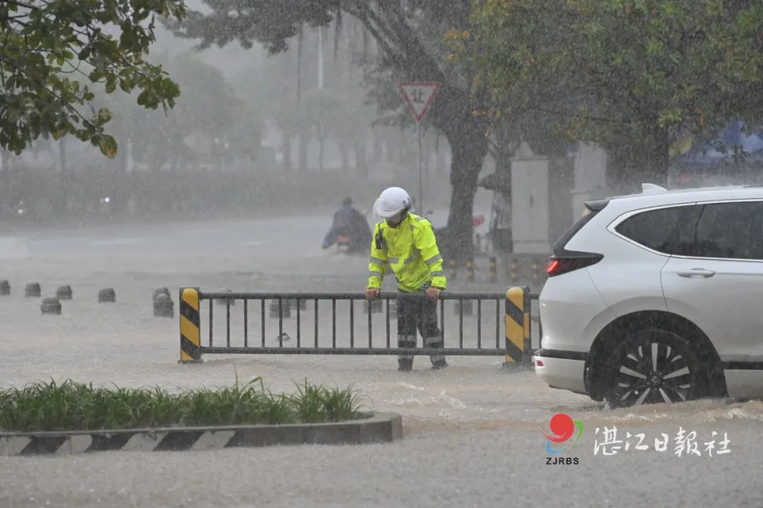 在麻章區(qū)湖光路涵洞路段,一臺SUV拋錨水中,車輛無法啟動,看著車窗外仍在持續(xù)的大雨,隨著水位不斷上漲,積水已淹沒了大半個輪胎,車主急得如熱鍋上的螞蟻。緊急關(guān)頭,機(jī)動調(diào)配的交警趕往現(xiàn)場,冒著膝蓋深的積水,成功將車輛推離積水區(qū),避免了車內(nèi)進(jìn)水。