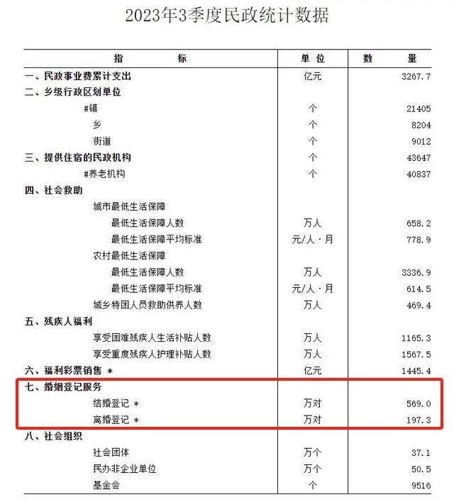 11月10日,民政部網(wǎng)站發(fā)布了《2023年3季度民政統(tǒng)計(jì)數(shù)據(jù)》,據(jù)統(tǒng)計(jì),今年前三季度,全國(guó)辦理結(jié)婚登記為569.0萬(wàn)對(duì),辦理離婚登記197.3萬(wàn)對(duì)。2022年前三季度,全國(guó)共辦理結(jié)婚登記544.5萬(wàn)對(duì),辦理離婚登記164.3萬(wàn)對(duì)。相較而言,今年前三季度結(jié)婚登記量較去年同期增加24.5萬(wàn)對(duì),離婚登記量同比增加33萬(wàn)對(duì)。