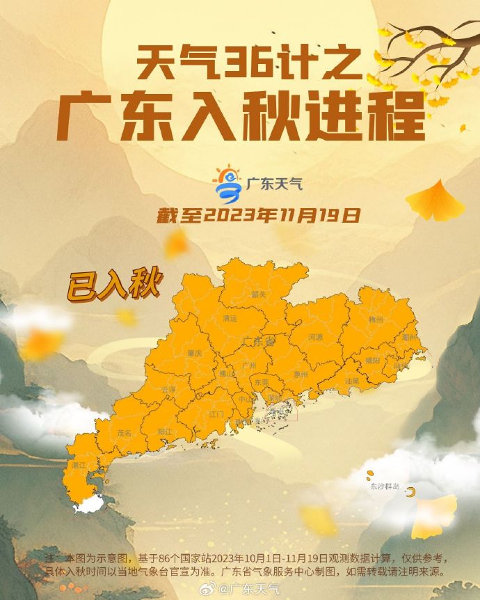 據(jù)@廣東天氣,截至11月19日,除了徐聞,廣東其余地區(qū)均已入秋(簡標(biāo)算法)。(備注:若采用滑標(biāo)算法,汕頭、化州、茂名、電白、徐聞、雷州、湛江、吳川、鶴山、斗門、惠陽仍未入秋)。