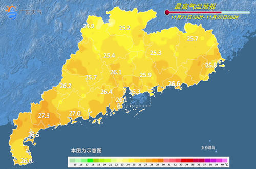 21日,廣東全省晴天,早晨最低氣溫:中北部市縣10~13℃,南部市縣13~17℃。