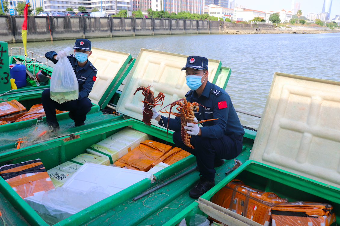 廣東海警執(zhí)法員檢查涉案貨物。廣東海警局供圖