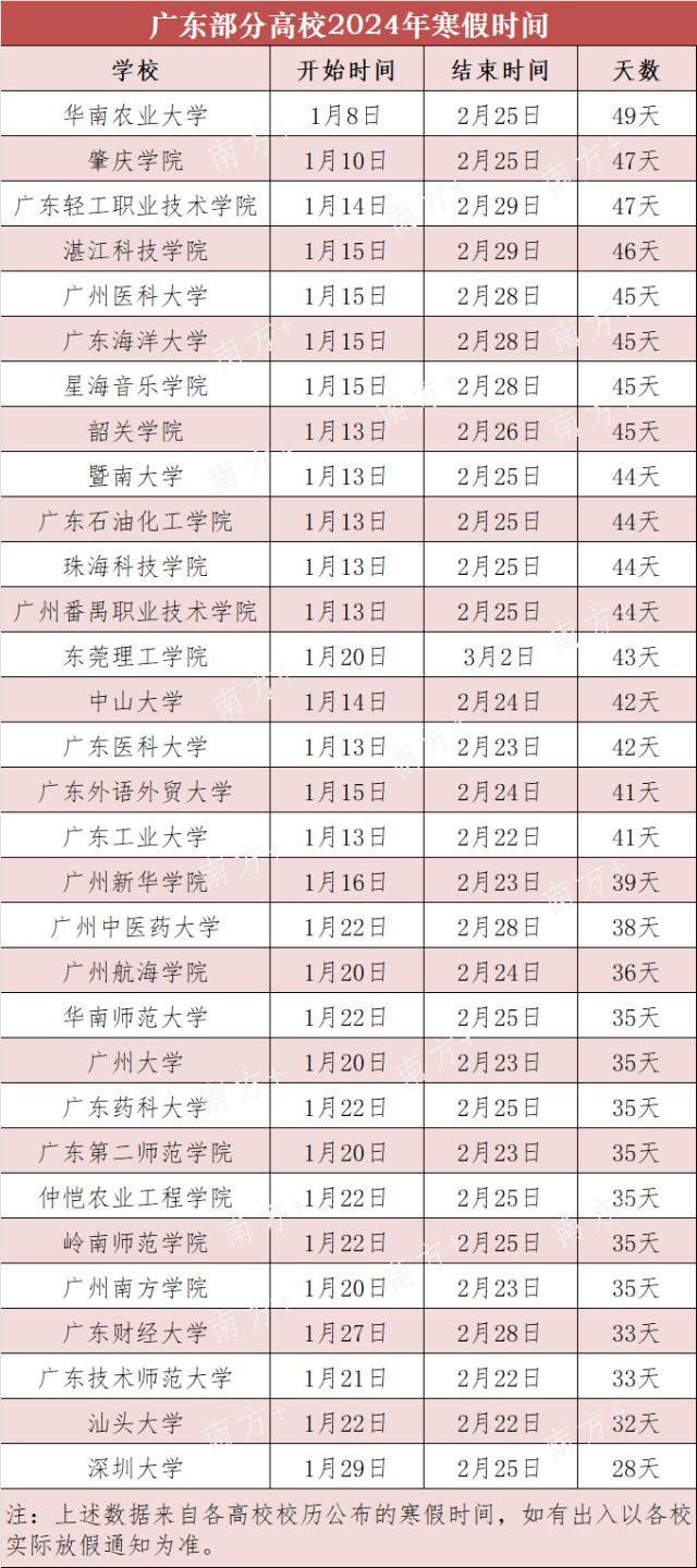根據(jù)廣東高校公布的校歷,據(jù)不完全統(tǒng)計(jì),大部分高校在2024年1月中旬放寒假,2月底開(kāi)學(xué),放假時(shí)間最長(zhǎng)的有49天,最短的28天。