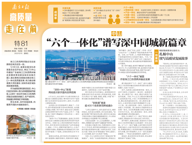 著力推動(dòng)深中“六個(gè)一體化”,是中山建設(shè)珠江口東西兩岸融合互動(dòng)發(fā)展改革創(chuàng)新實(shí)驗(yàn)區(qū)的破題口,也是“方法論”。