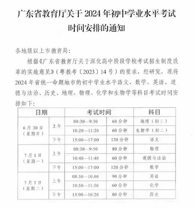 《關(guān)于2024年初中學(xué)業(yè)水平考試時間