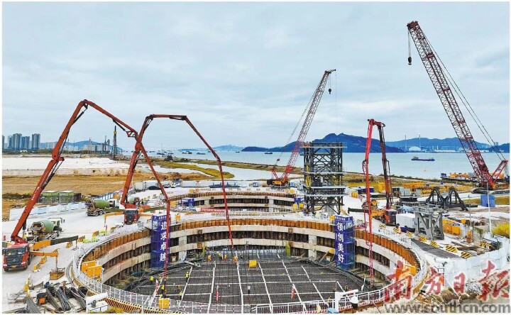 獅子洋大橋東主塔左幅承臺(tái)澆筑現(xiàn)場(chǎng)。南方日?qǐng)?bào)記者 石磊 通訊員 雷健 攝