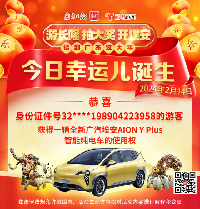 好人啟好運(yùn),最暖是廣東。2月14日19時(shí)許,由南方+、觸電新聞主辦的“請(qǐng)到廣東過大年之游長(zhǎng)隆、抽大獎(jiǎng)、開埃安”活動(dòng)繼續(xù)傳遞好運(yùn),開出第六個(gè)大獎(jiǎng)。隨著“中國(guó)好人”朱化學(xué)按下開獎(jiǎng)鍵,身份證號(hào)“32****198904223958”鎖定在大屏幕,江蘇游客吳先生將獲得一輛全新廣汽埃安AION Y Plus智能純電車的使用權(quán)。